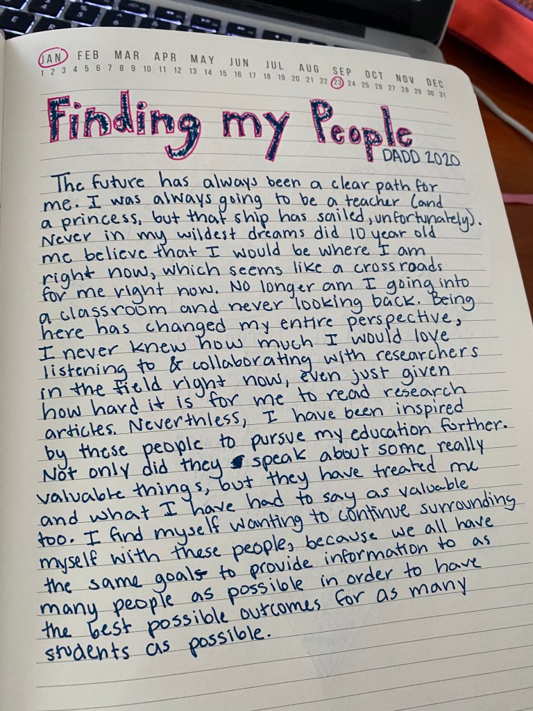 That got me thinking a lot about not only the students I want to teach, but also myself. I can sometimes struggle with my memory, and having something that I can go back to that allows me to think back to what happened in a particular moment or on a particular day is really special. I want to teach student with significant disabilities, so giving them a space where they can reflect on what is going on in their lives is also really important. Some of these students don’t always have a way to have a ton of different traditionally “exciting” experiences, for medical or other reasons. Using the writers’ notebook as a catalyst for them to write about what is important to them and as something I can use to introduce them to new things and learning experiences is exciting. I look forward to implementing a writers’ notebook in my classroom in the future, so I can help my student’s to celebrate what happens in their lives, as well as to react to thing that they have learned. At the end of the year, it will be so rewarding when they can go back into their notebooks and see all that they have accomplished and experienced.