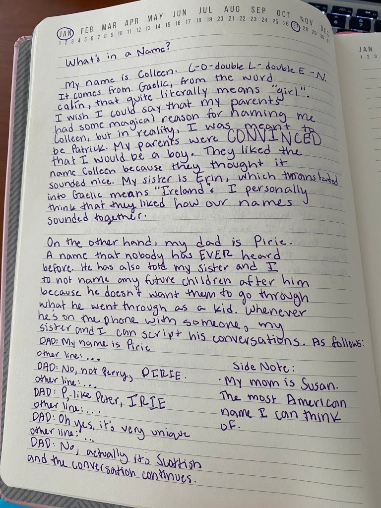 In “Brown Girl Dreaming”, I really connected with a few different moments within the book. One of the poems that stood out to me was, of course, the poem she wrote about her name, “A Girl Named Jack” (p. 6-7). As somebody with a unique name, and as someone who was “supposed” to be a boy, I felt Woodson’s words deep in my soul. As my journal entry below states, “I was an “almost” Patrick.” I’ll admit, I am incredibly grateful to not be a “Patty” or something along those lines. See my “What’s in A Name?” notebook entry below: