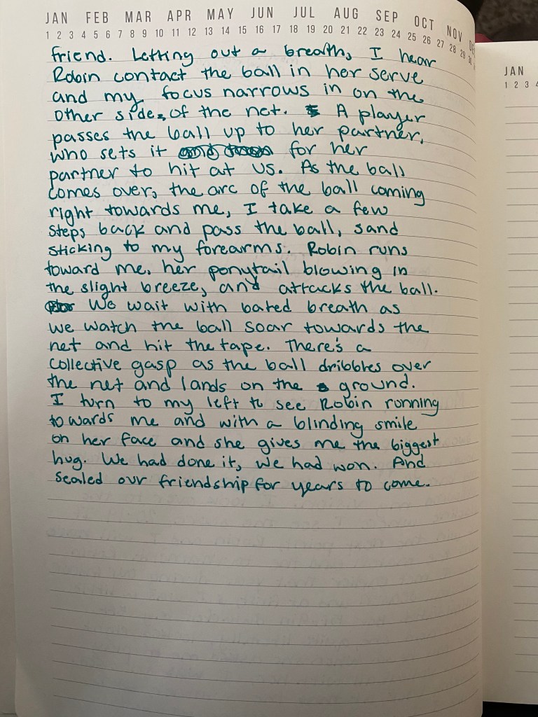 Looking at my work, I know that it isn’t my strongest work, but I think that our students will face that too. It was really easy for me to become discouraged that my writing wasn’t coming out the way that I had wanted it to and as teachers, we need to be prepared for when our students will go through phases like this. Part of what I told myself was that I just needed to get something on paper. It didn’t have to be any particular length and it didn’t have to be perfect, but I needed to get something out. With that thought process, I churned out this incredibly rough draft of a personal narrative, using the strategy from “Mentor Texts”.